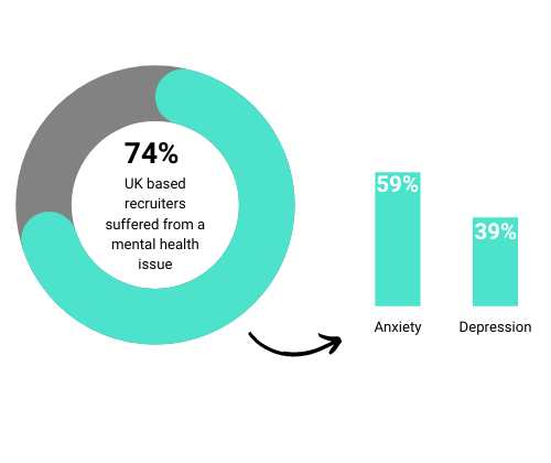 It is estimated that at least 74% of UK based recruiters have suffered from some form of mental health issue in the last year. Anxiety is found to be the most prominent, with 59% of people suffering from the condition, whilst 39% have experienced depression.